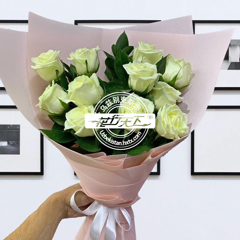 描述: 11枝白玫瑰、配绿叶、精美包装。